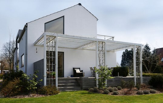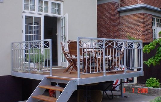 Type: Hævet træterrasse med dæk og gelænder udført i hvidolieret lærketræ. Selve konstruktionen er lavet i miljøcertificeret Superwood. Tidligere var der nedgang til haven via en stor stentrappe omkranset af to statelige træer. Da træerne døde, så trappen så nøgen ud, at ejerne tænkte, at nu var det tid til at slippe for bøvlet med at skulle gå op og ned ad trapper for at komme ud i det fri. De fik derfor bygget den hævede terrasse som en længe ønsket forlængelse af køkkenet.