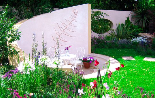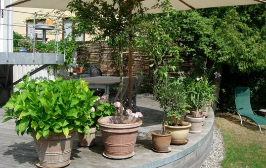 Type: Terrassen er i sibirisk lærketræ og placeret op ad en mur for at få læ. Placeringen er også valgt, fordi det især for 20 år siden, da havens øvrige beplantning var lavere, var det sted på grunden, hvor aftensolen ramte. Her stod i forvejen et ældre og stort æbletræ.