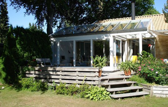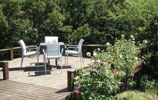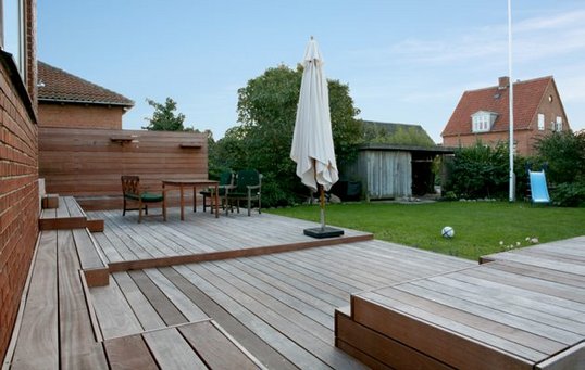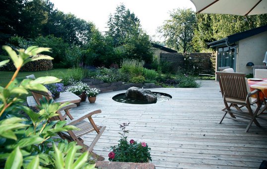 Type: Træterrasse lavet af almindelige terrassebrædder hævet ca. 20 cm over jordniveau, så du kan gå direkte fra havedøren og ud på terrassen. Terrassen blev anlagt for fem år siden.