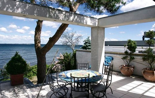 Indretning: Det specielle ved et ellers simpelt terrassedæk er det integrerede æbletræ, hvis lange grene breder sig over halvdelen af terrassen. Det giver sydlandsk stemning og får terrassen til at virke som et halvlukket, hyggeligt rum. Om sommeren hænger familien lyslanterner i grenene. Det understreger æbletræets funktion som et hyggeligt tag.