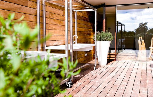 – Ud over bonussen ved at terrassen får vores køkken til at virke større, så gør konstruktionen i højden, at vi neden under trædækket har masser af opbevaringsplads til havemøbler og -redskaber, fortæller Mette Fog.