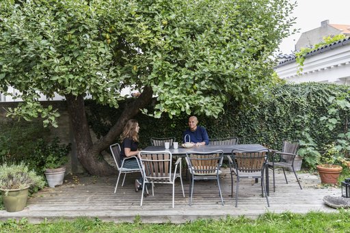 Hvordan bruger I terrassen? – Da vi bor på 1. sal, er det ikke hver aften, vi slæber maden med ned på terrassen, men vi er her tit og slapper af i skyggen og holder også gerne fødselsdage for mange her. De bedste stunder er sommeraftener, hvor mørket falder på, og vi takket være æbletræet kan holde lidt på varmen og samtidig nyde lyslanternerne og stilheden, siger Bent Gringer.