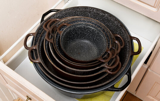 - Køb nogle gode knive og sørg for at få dem slebet en gang om året. Jo bedre kvalitet du køber fra begyndelsen, jo flere penge sparer du i længden. Jeg har også de uundværlige gryder, mormorgryderne. De er lavet i Frederiksværk og er ægte stålgryder, der aldrig brænder på, siger Mik Schack, der faktisk har købt et særligt solidt skuffedarium til stålgryderne.
