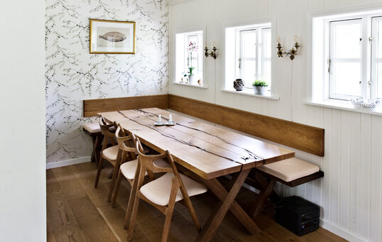 Thomas Rode: Køkkenet skal både kunne bruges og være levende. Det er blandt andet også derfor, vi har lavet hele rummet til et køkkenalrum. Vi er altid sammen om at lave mad også med vores børn - og bruger meget tid på at spise sammen. Derfor faldt vi for tanken om en slagbænk og et stort spisebord så vi fik skabt et hjørne, hvor man har lyst til at blive hængende.
