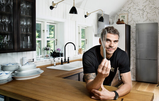 I dette køkken i en ældre villa i Københavns Nordvestkvarter - regerer tv-kok Mik Schack. Som han står i sin farverige skjorte og smiler midt i det hele, føler han sig tydeligvis hjemme.