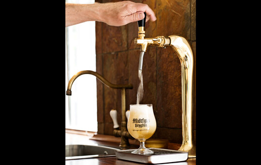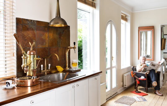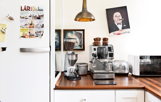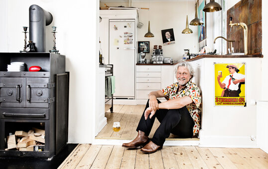 - Der kan sagtens være mange mennesker i køkkenet på én gang, selv om det er lille. Når jeg har gæster, havner vi tit her. Man kan stå 14 her på én gang og alle samles ofte om fadølsanlægget. Og når jeg har lavet tv-optagelser, er vi jo også mange i køkkenet på én gang, fortæller han.
