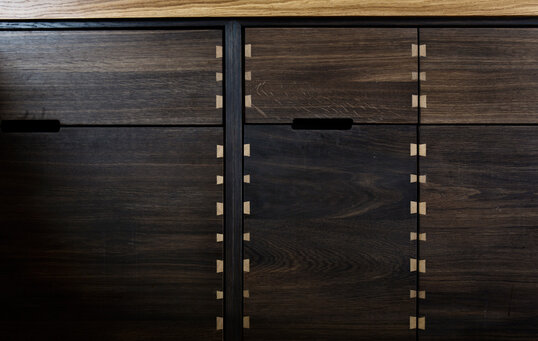 Alle skabe og skuffer er blevet lavet af træ, der er tappet sammen i stedet for at blive sat sammen med søm og skruer. Og så er både spisebordet og den store køkkenbordplade skåret ud af noget helt fantastisk gammelt træ, som i store revner er tappet sammen af træ i en mørkere nuance.