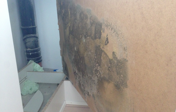 Bygherrer vasker det af og stiller en kondenstørrer ind. Fugten i murren måles til at være omkring 25 og ikke kun i skabet, men hele vejen hen langs væggen.