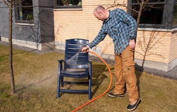 Glem alt om dyre rengøringsmidler, wienerkalk og skrappe kemikalier. Du skal blot bruge en haveslange med spuler, skuresvamp og karklud til at gøre plastikhavemøblerne rene med.