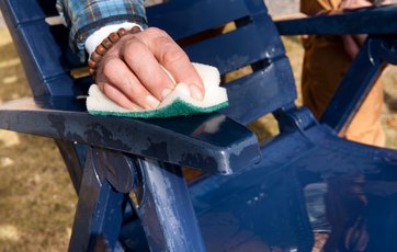 - Rens havemøbler af træ ordentligt med et trærengøringsmiddel (kan normalt købes samme sted, som møblerne er købt).