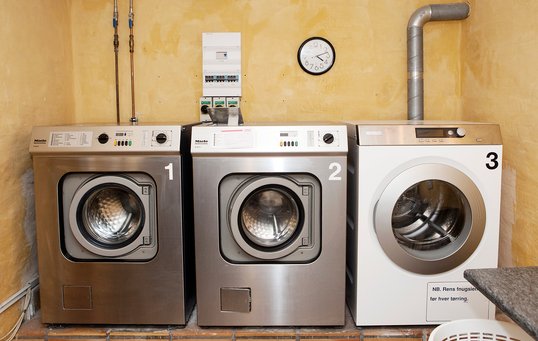 - Hvad angår strøm, så vasker vi CO2-neutralt. På en dag, hvor solen bager ned, og vaskemaskinerne kører løs, ender elmåleren med at stå stille, fortæller Kristian.
