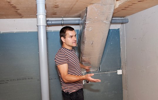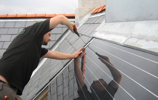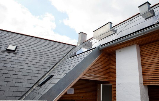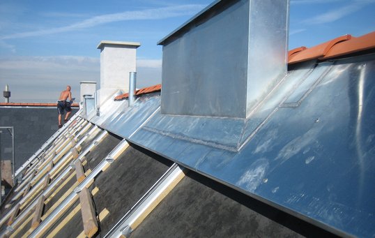 På etageejendommens tag var der mange små elementer som skorstene og udluftningskanaler, der ville komme til at kaste skygger på panelerne og dermed forringe deres effekt. Derfor måtte badeværelsesudluftningen og den gamle køkkenskorsten omdirigeres til tagets kip.