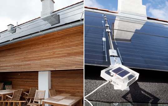 Den lille referencecelle måler, hvor meget lys der rammer anlægget. Den bruger Kristian til at tjekke, om solcellerne indfrier forventningerne. Foto: Mette Frandsen
