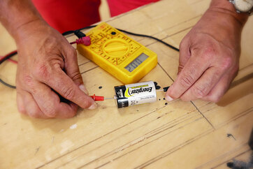 Det kan være, at apparatet ikke virker, fordi batteriet er dødt. Uanset om det er et standardbatteri som på billedet eller et særligt batteri til en bestemt type elektrisk apparat, kan du bruge multimeteret til at tjekke, om der er spænding på batteriet. Indstil multimeteret til jævnspænding, og sæt de to ledninger på hver sin pol af batteriet.