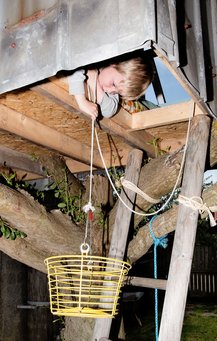 De gik i gang med at bygge hulen af genbrugstræ fra renoveringen af overetagen i huset, og efter en måneds tid stod den færdig. Siden er der kommet hængebro og svævebane til.
