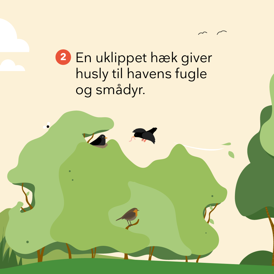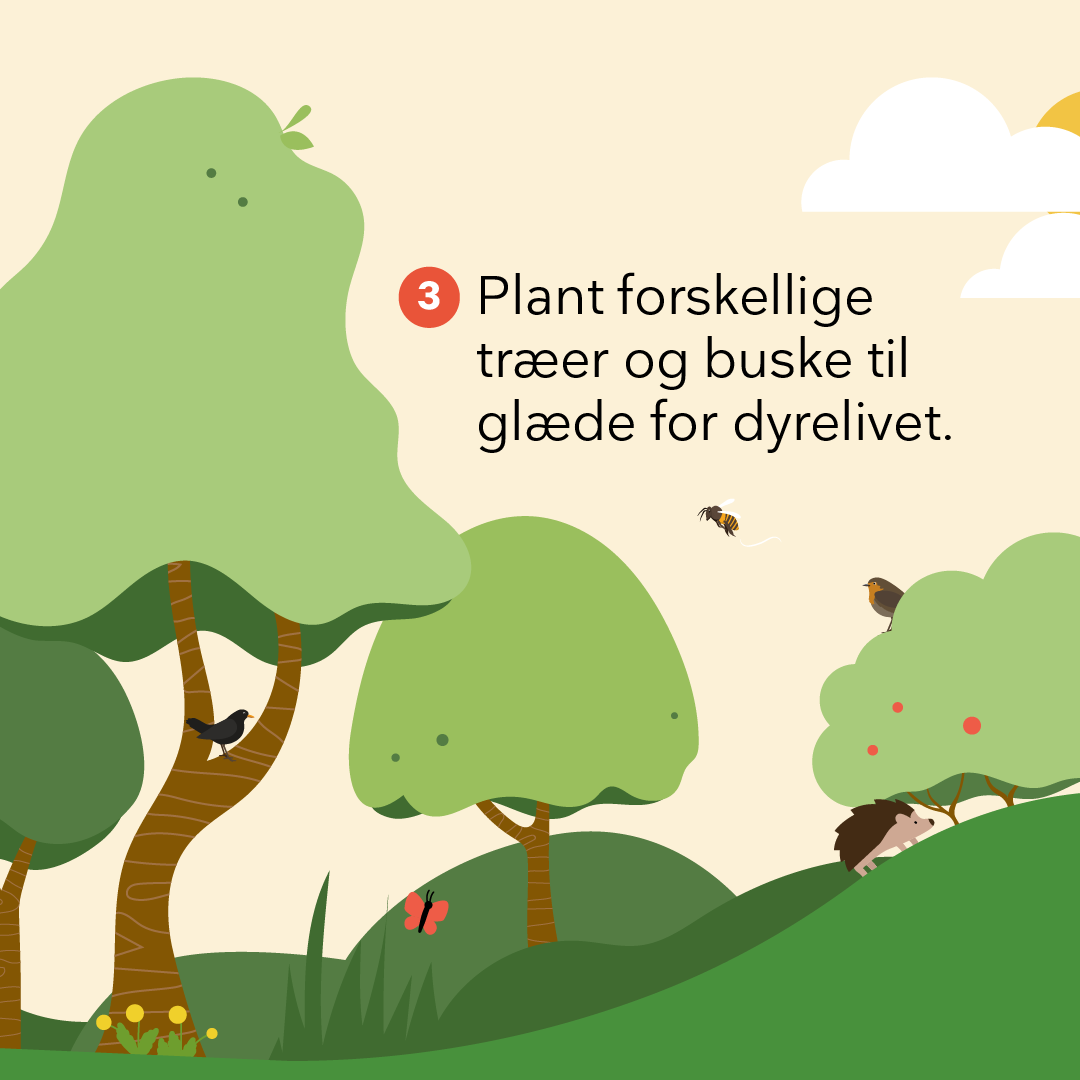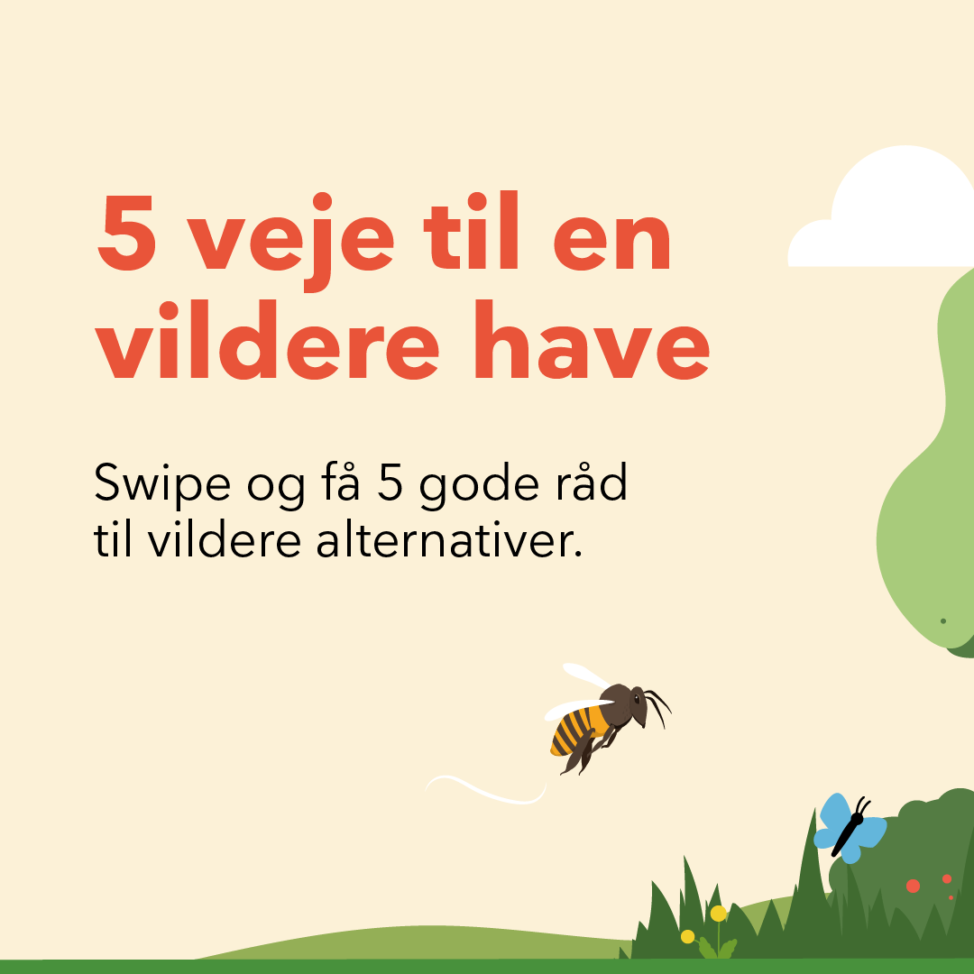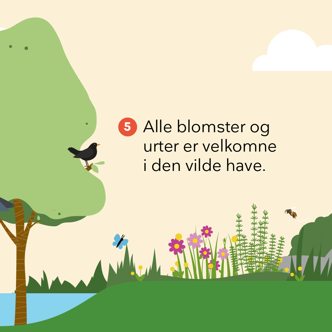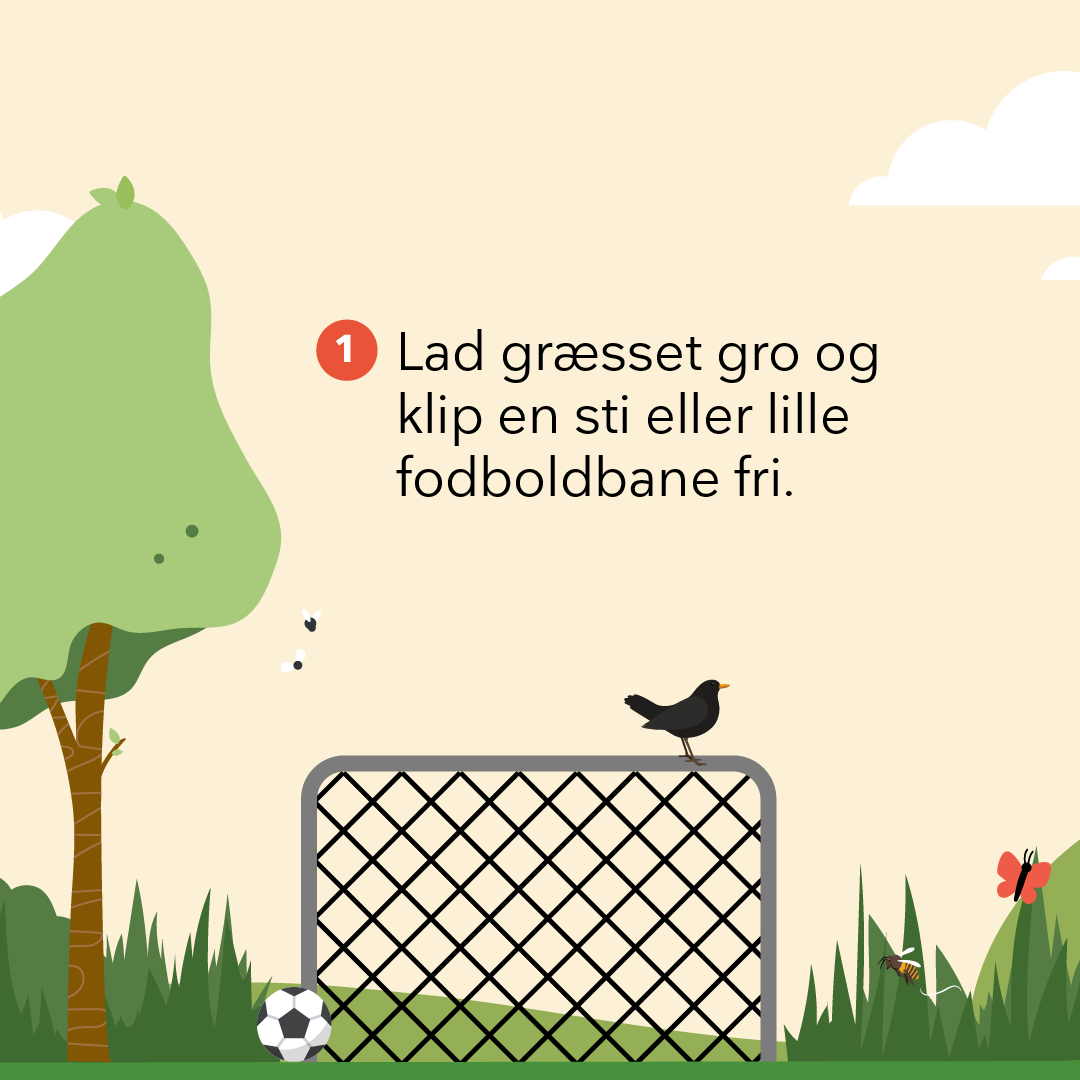 Slåede græsplæner er nemlig ikke til meget gavn for naturen, da der typisk ikke findes hverken føde eller gemmesteder i den kortklippede græsplæne. Lad i stedet græsset gro og klip stier og evt. en lille fodboldbane fri.