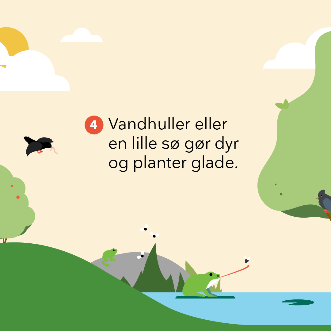 Der er ikke meget, der kan overleve uden vand, og ønsker du en høj artsdiversitet i haven, kan du få brug for at tilføje et element af vand. Du behøver ikke anlægge en hel dam eller sø, men sørg for at der er både blankt vand til de lidt større dyr, samt fugtige områder til fx padder og kryb, der foretrækker fugtige omgivelser.