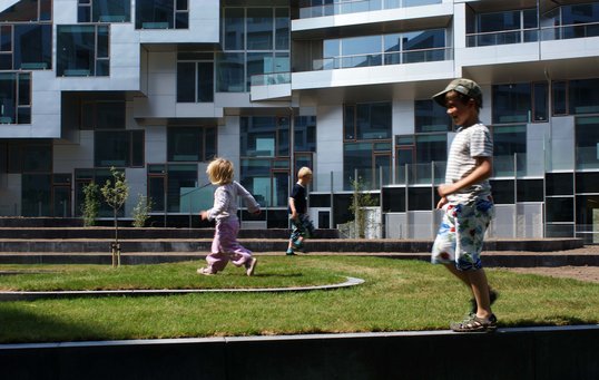 - Man skulle gerne have en følelse af at befinde sig i en blanding af italiensk bjerglandsby og københavnsk boligkarré, har Bjarke Ingels tidligere sagt om 8tallet, der ligger med skøn udsigt over Kalvebod Fælleds store naturområde.
