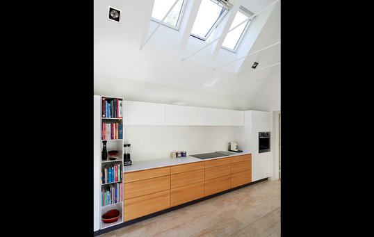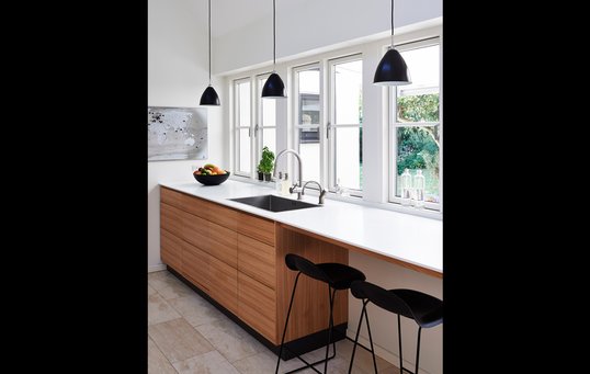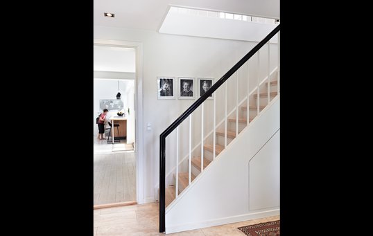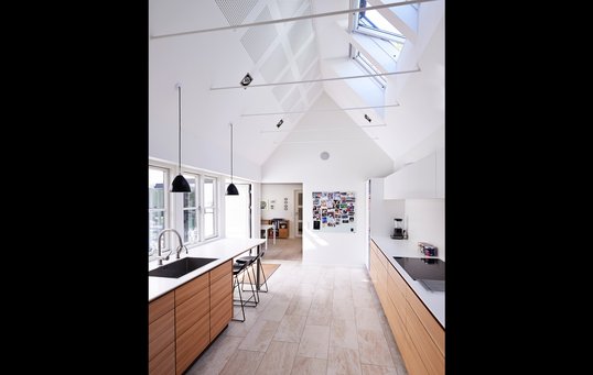 Løsningen blev at rykke køkkenet ud i glasmellemgangen, der til gengæld blev udvidet med lige præcis de 7 m2, som bebyggelsesprocenten tillod. En genistreg, der med ovenlysvinduer og en formfuldendt køkkenindretning blev hele husets 'missing link' - det naturlige mødested, hvor alle elsker at mødes.