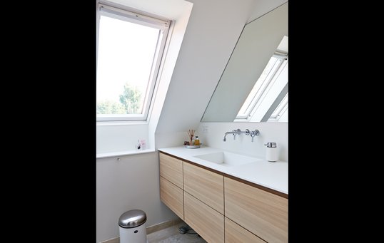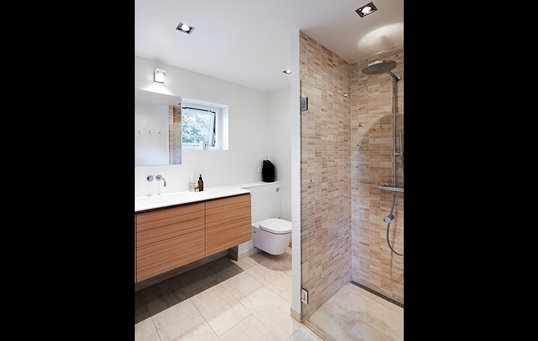 Samtidigt fik huset 2 nye badeværelser og nye, større vinduespartier, der trækker haven ind i stuen. Desuden nyt bryggers og nye vinduer og døre overalt, indvendigt og udvendigt, samt renovering af gavle og facader.