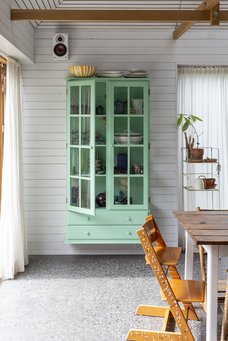 Drengene får vind i håret, når de tager en gyngetur i spærene i køkken-alrummet. Her er der plads til børnene og en legende tilgang til, hvordan man kan bo. Betongulvet, der løber igennem hele huset, er terrændækket, som er slebet. Princippet var at skrælle gulvet af. Til gengæld har betonen fået noget pigment, og parret har selv valgt de sten, man kan se i gulvet.