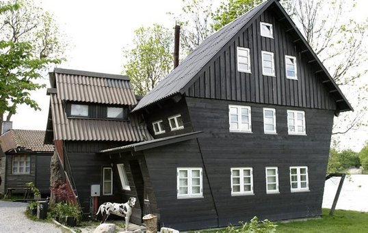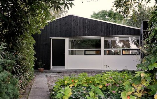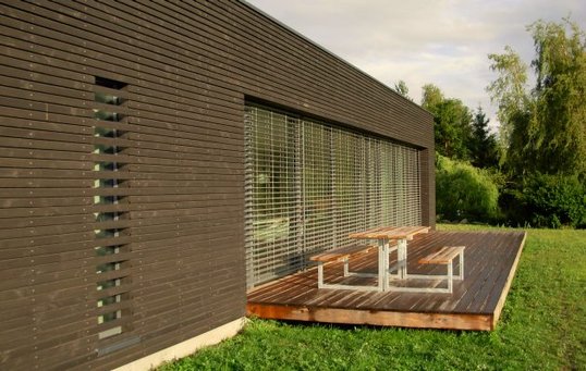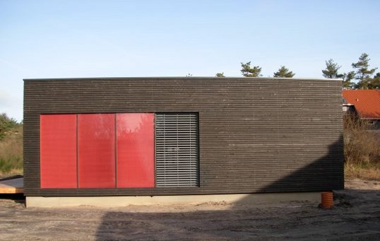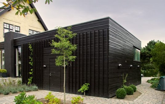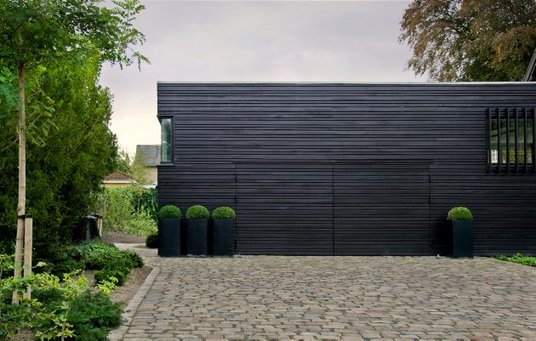 Arkitekt Olav Langenkamps hus "Villa Langenkamp" er beklædt med sortmalede lister af lærketræ. Der er en luftspalte på bagsiden af listerne, som gør, at listerne konstant er ventileret tilstrækkeligt. Garageporten kan lige anes. Foto: Jørgen Toubro