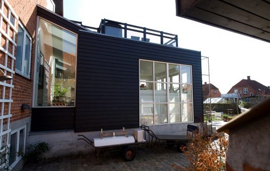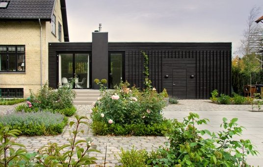 På den anden side af tilbygningen er der leget med formen, så der løber et lodret "gitter" af træ foran vinduerne. Der er desuden integreret en dobbelt carport, som lige anes i den sorte facade. Foto: C.F. Møllers Tegnestue
