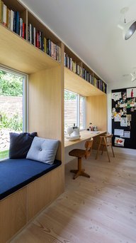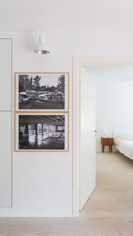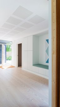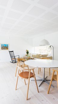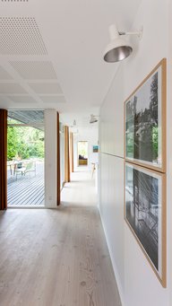 - Materialer indvendigt: Plankegulve fra Dinesen i lud- og sæbebehandlet douglasgran, alkove med skrivebord i egetræsfiner i kontoret. Køkken, skabe og alkove i entréen i hvide elementer fra Kvik.