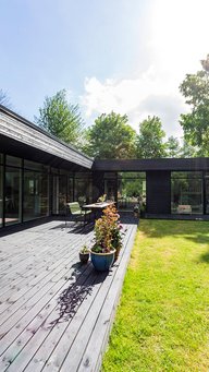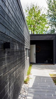 - Proces: Byggegrunden i udkanten af København blev købt i 2015. Herefter tog det ni måneder at tegne huset og indgå kontrakt med entreprenøren. En længere periode end normalt, fordi familien havde ændringer og tilføjelser til arkitekternes tegninger og materialevalg. I august 2016 gik byggeriet i gang, og huset stod færdig syv og en halv måned senere i april 2017. Da familien flyttede ind, gik de selv i gang med at lave haven og bygge terrassen. De har også selv sørget for køkkenet og skabene i entréen og er desuden kommet med en masse ideer og forslag undervejs i processen. Under byggeprocessen havde Marie og Jacob hyret en ingeniør til at styre projektet på byggepladsen.