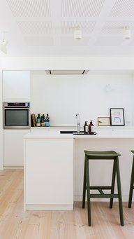 Køkkenet er derfor også helt simpelt i hvidt med grebsløse skuffer.