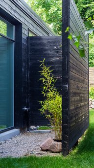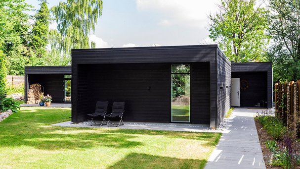 - Materialer udvendigt: Trælameller i sortmalet, trykimprægneret fyrretræ og tagpap på taget.