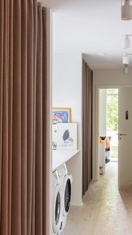På samme måde er gangen ned til børneværelserne nemlig blevet bredere, så den ikke blot fungerer som fordelingsgang, men også er et bryggers. Langs rummet er alt børnenes tøj opbevaret, og der er plads til både vaskemaskine, tørretumbler, tørrestativ og et arbejdsbord.