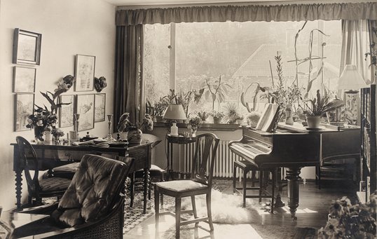 Arne Jacobsen indrettede sig desuden med en del møbler, som man kunne forvente at finde hos en bedsteborger fra det 19. århundrede: antikke stole, ægte tæpper, et bord og et flygel med snoede ben og en masse nips.