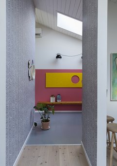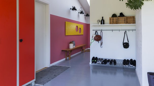 Astrid Østergaard Nielsen elsker farver og står bag udsmykningen af entréens pink og gule indslag.