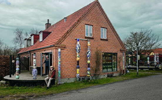 Hækken er erstattet med totempæle med keramikmasker. På vejen til hoveddøren passerer vi en rund terrasse, ænder i keramik og krukker i alle farver. Man kommer uvilkårligt til at tænke: Hvem mon bor her?