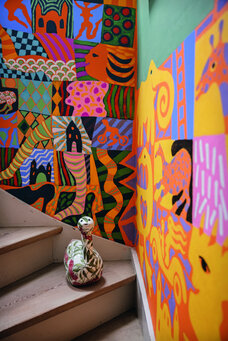 Det er en farverig æstetik, der udfolder sig i huset, hvor væggene har forskellige farver og er fyldt med store malerier. Alt ånder kreativitet. Trivielle ting som tv og køkkenmaskiner er intet sted at finde.