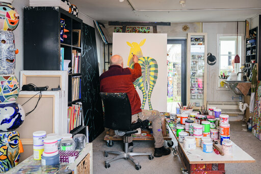 – Jeg tænker ikke over det. Det sker bare, at jeg ændrer på omgivelserne. Det har været sådan altid. Jeg kan huske helt tilbage til dengang, jeg som ung boede på Frederiksberg i en etageejendom sammen med nogle andre. Jeg syntes, det var skørt, at der var asfalt helt hen til hækken, og så fik jeg de andre med på, at vi brød asfalten op og satte borde og bænke op til fællesspisning. Og da vi boede i Valby, blev hækken til en række elefanter. Det startede med, at hækken var skæv, og så i stedet for at klippe den lige blev det til elefanter, fortæller Flemming H, der står bag de mange abstrakte malerier med dyr, mennesker og mønstre, som hænger på væggene i huset.