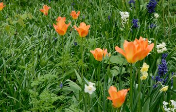 Tulipa fosteriana Orange Emperor er en hybrid af den vilde tulipanart Tulipa fosteriana, som vokser i bjergene i Centralasien. Den blomstrer villigt år efter år og er fx god til forvildning i blomsterløg-engen, som det ses på billedet. Store klart orange blomster i begyndelsen af maj, kun omkring 30-40 cm høj.
