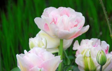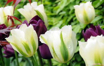 Mount Tacoma er en god, gammel traver, men tulipanen med de flødehvide, dobbelte blomster har masser af potentiale til at blive en af de mest populære i klassen. Denne sort er nemlig en af de få dobbelte, der blomstrer igen i flere år i træk. Blomstringen forekommer sidst i maj, og den bliver ca. 45 cm høj. Her ses den sammen med Wirosa.