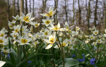 Skovtulipan,Tulipa sylvestris. Denne vilde art, som bl.a. stammer fra Sydeuropa, findes også forvildet til den danske natur. Den kan lide muldet jord og halvskygge og vil her brede sig til smukke grupper med elegante gule tulipaner, der kun bliver flere for hvert år. Meget yndefuld i buketter, og så dufter den. Ca. 40 cm høj, blomstrer i maj.