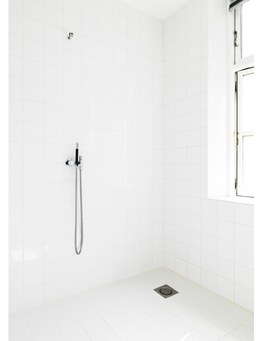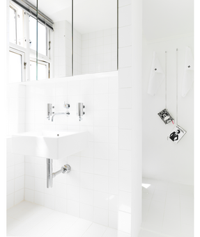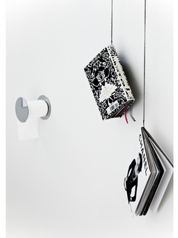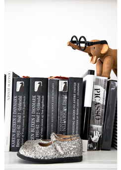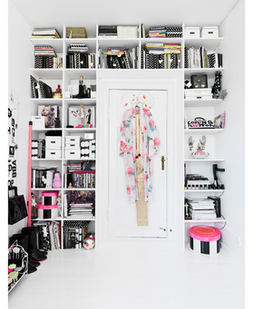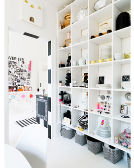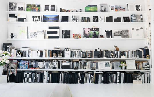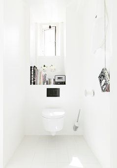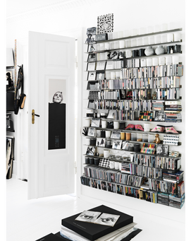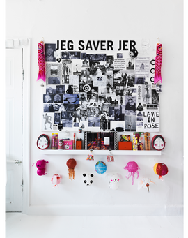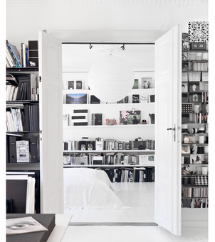 Når man sætter sig på toilettet, flyver en smuk bog, der hænger ned fra loftet i en snor, næsten ind i hånden på én, og bøgerne i de lange bogreoler er alle konsekvent bundet ind i sort-hvidt bogbind, som giver en æstetisk ro og en grafisk effekt i rummet. Sort-hvid fotografier af inspirationskilder og forbilleder som Pippi Langstrømpe, Coco Chanel og Albert Einstein giver et meget levende hjem, hvor man mildest talt føler sig i godt selskab.