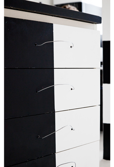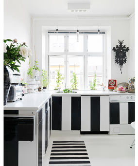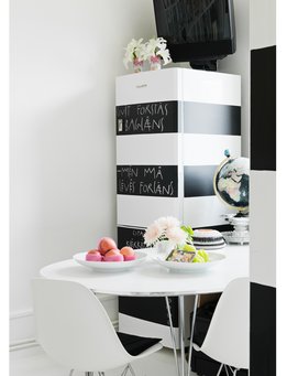 Bøgerne i bogreolen har fået sort-hvid bogbind på, så de fremstår mere æstetiske – og køleskabet er malet så det matcher bogbindet. Kunstmaler Tenka Gammelgaard er konsekvent, når det drejer sig om indretningen i hendes hjem – en gammel herskabslejlighed midt i kongens København med udsigt til Amalienborg Slot og Marmorkirken. Her har hun boet og arbejdet i over 20 år, og man mærker tydeligt hendes personlige fingeraftryk i hver en sprække af de 250 kvadratmeter.