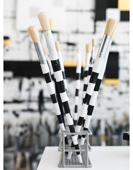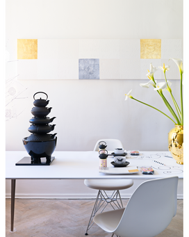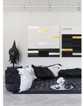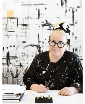 Hun er billedkunstner med en mangeårig karriere både internationalt og i Danmark. I mere end 30 år har hun konsekvent arbejdet med sort og hvid i sine værker. Kun suppleret af ædelmetaller som guld og sølv. Derfor er det også kun naturligt, at det er de samme to farver, der går igen i hendes private hjem.