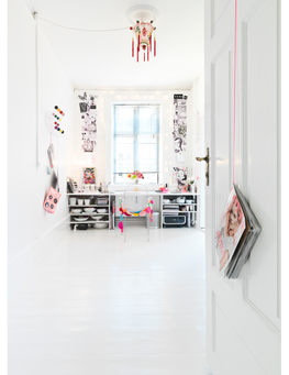 - Det vigtigste i mit hjem er, at man ikke må føle sig begrænset. Der skal være plads til både fantasi og til at være alvorlig. Til at male på gulvet – og til at sidde pænt ved bordet, fortæller hun.