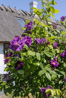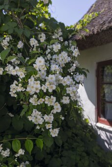 Roser hører sig til ved et gammelt bondehus. Her er det en New Dawn, der vokser op ad husmuren.