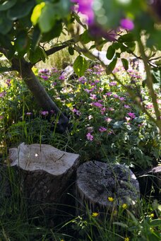 Birgits have veksler mellem græsplæne – hvor græsset ikke er klippet ned – og små blomsterbede. Det er en have, hvor man kan gå tur og hele tiden opdage noget nyt, fordi den består af mange små rum.