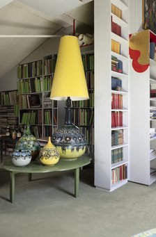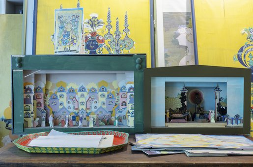 Arbejdsværelset og atelieret ligger i husets stueetage med udsigt til haven og vejen. Alt står fuldkommen som havde Wiinblad lige forladt rummet.