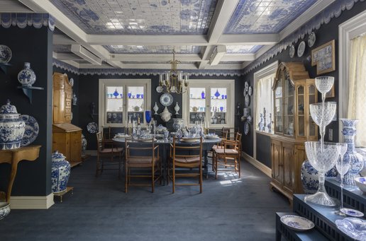 Der findes ikke mange blåmalede træhuse i Danmark, og ikke mange kunstnere med lige så stor international succes som Bjørn Wiinblad. Det Blå Hus med Frilandsmuseet i Lyngby som nabo var lidt aparte og passede derfor perfekt til sin ejer, der var alt andet end traditionel i sin designstil og væremåde. Foto: Julie Vöge