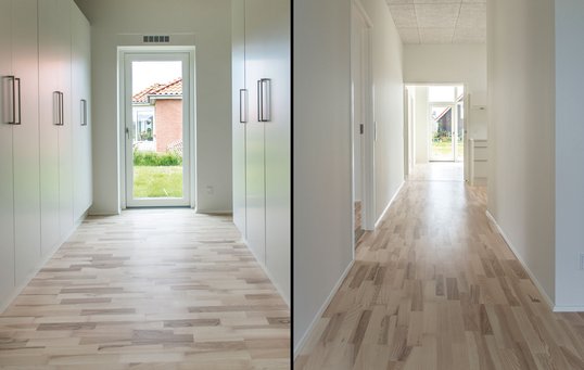Huset er bygget i 2014 og strækker sig over 157 m2 i ét plan med central entre/gang, soveværelse med walk in-closet, spisestue, opholdsstue, åbent køkken, to bad/toiletter og tre værelser.