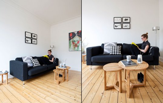 - Brug møbler til flere funktioner ad gangen, fx små indskudsborde, der kan bruges som skamler eller ekstra stole, når man har gæster.
